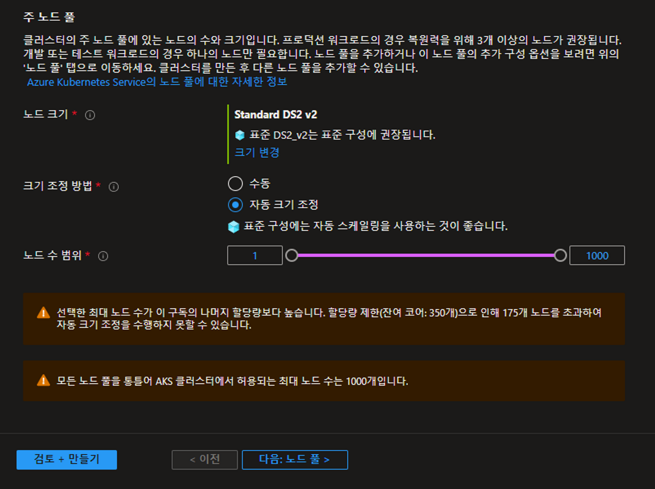 한 구독에 노드 할당량이 있으며 최대 노드는 1000개 이다.