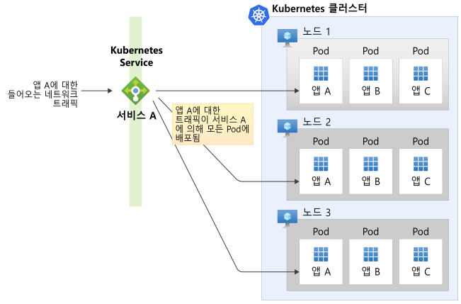 서비스는 Pod 그룹 앞에 위치하고 정적 IP 주소를 제공합니다. 서비스에 도달하는 트래픽은 일련의 백 엔드 Pod에 라운드 로빈 방식으로 배포됩니다.