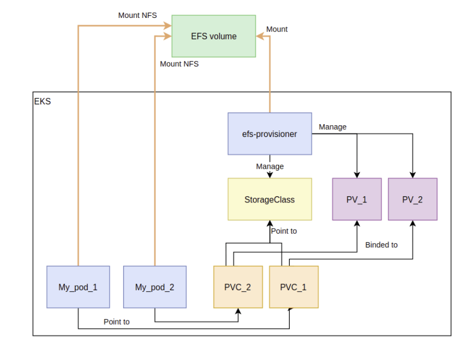 EFS는 EKS에서 여러 Pod들이 하나의 스토리지를 사용할 수 있도록 합니다.