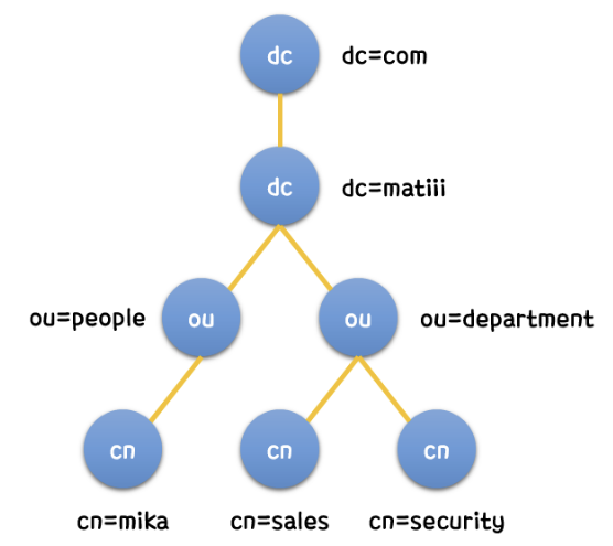 ex) 'cn=security'의 DN은 'cn=security,ou=department,dc=matiii,dc=com' 가 된다.