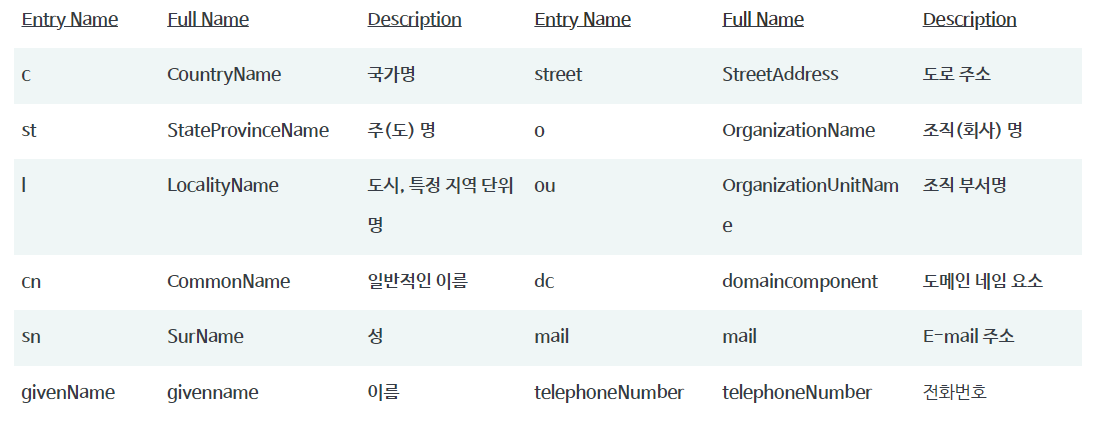 각 사용자나 개체는 고유한 DN(Distinguish Name)을 갖는데, 끝 노드부터 역순으로 올라간다.