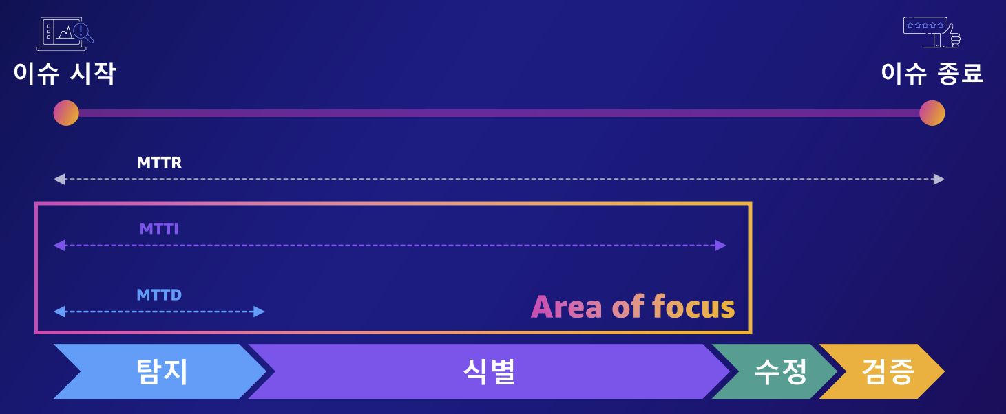 장애 발생 시 탐지 - 식별 - 수정 - 검증의 절차로 이슈가 발생한 후 부터 종료될 때 까지의 타임라인을 의미합니다.