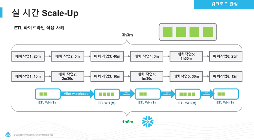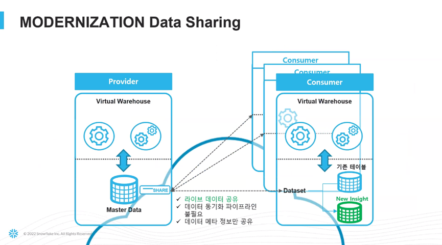 예를 들어, 일반적으로 DevOps팀에서 테스팅을 위해 데이터를 복제하면 비용이 발생 하지만 스노우플레이크는 메타 데이터를 가져와 테스트 환경 구축이 가능하기에 비용을 절감할 수 있다.