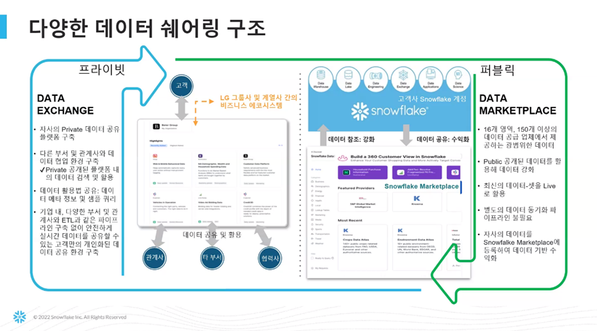 오라클, 테라데이터, SAP 등 온프레미스 기반의 데이터베이스 플랫폼과 달리 클라우드 데이터 플랫폼 시장을 바탕으로 성장하고 있는 솔루션으로, 기업의 온프레미스, 클라우드에서 프로그램 사이에 가상의 데이터 웨어하우스나 데이터 레이크를 제공하여 고객이 데이터를 더욱 쉽게 저장하고 활용할 수 있게 합니다.
