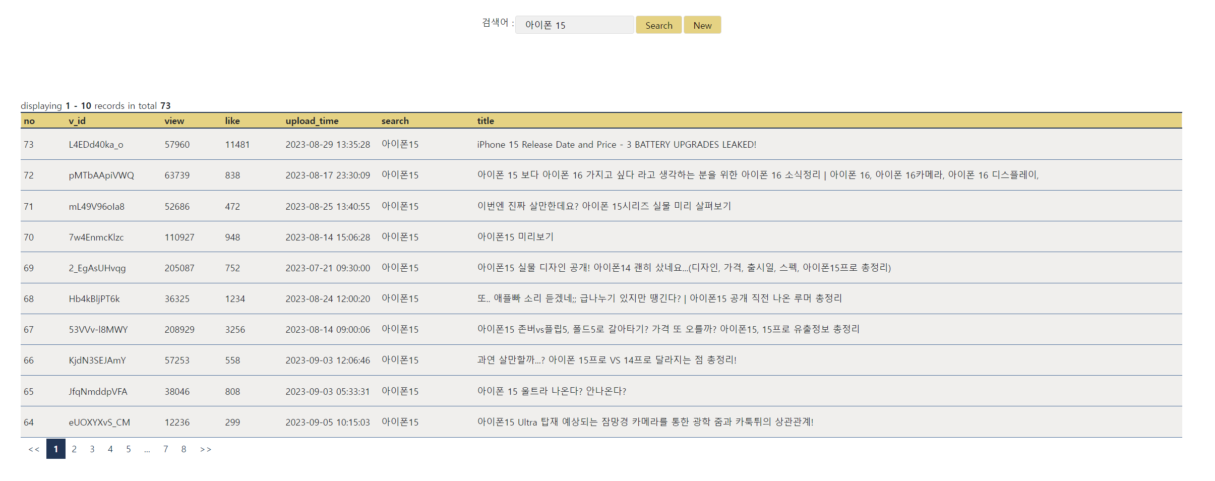해당 화면은 아이폰 15를 유튜브에 검색 했을 때 추출한 동영상 데이터를 페이징하여 출력한 화면 입니다.
