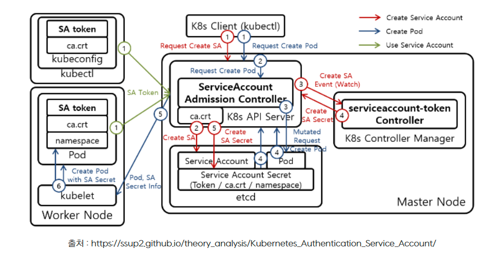 Service Account(이하 SA)는 Pod에서 실행되는 프로세스를 위한 것으로 Pod가 API 서버와 상호 작용할 수 있도록 권한을 부여하는 데 사용되는 자격증명이다.